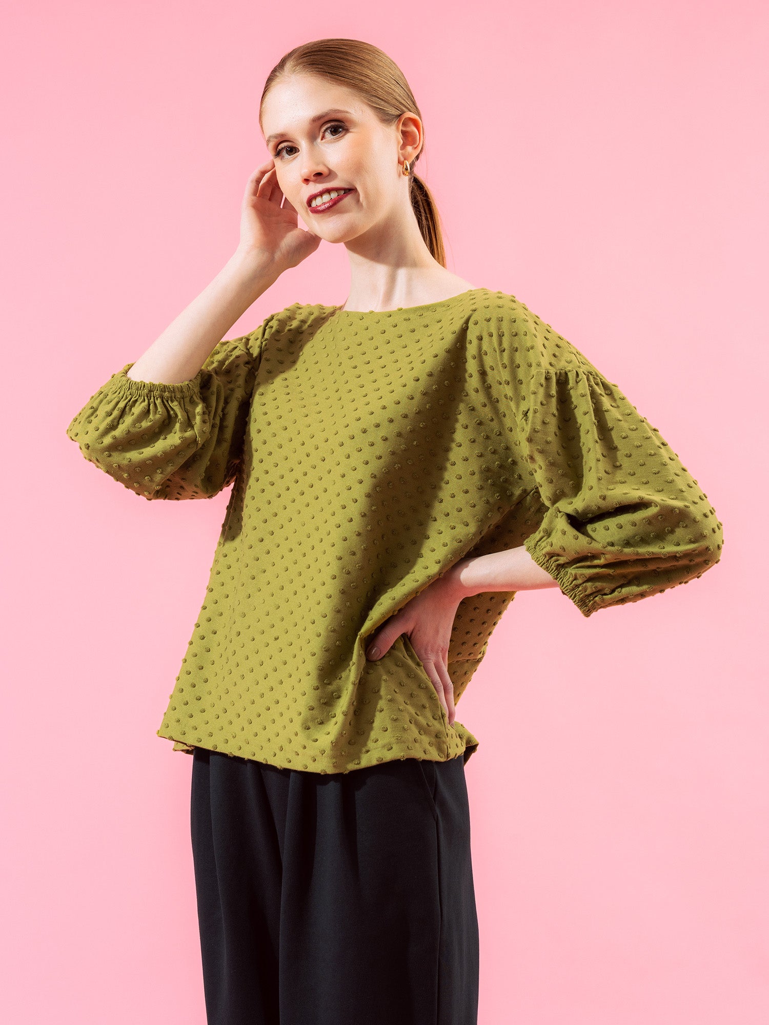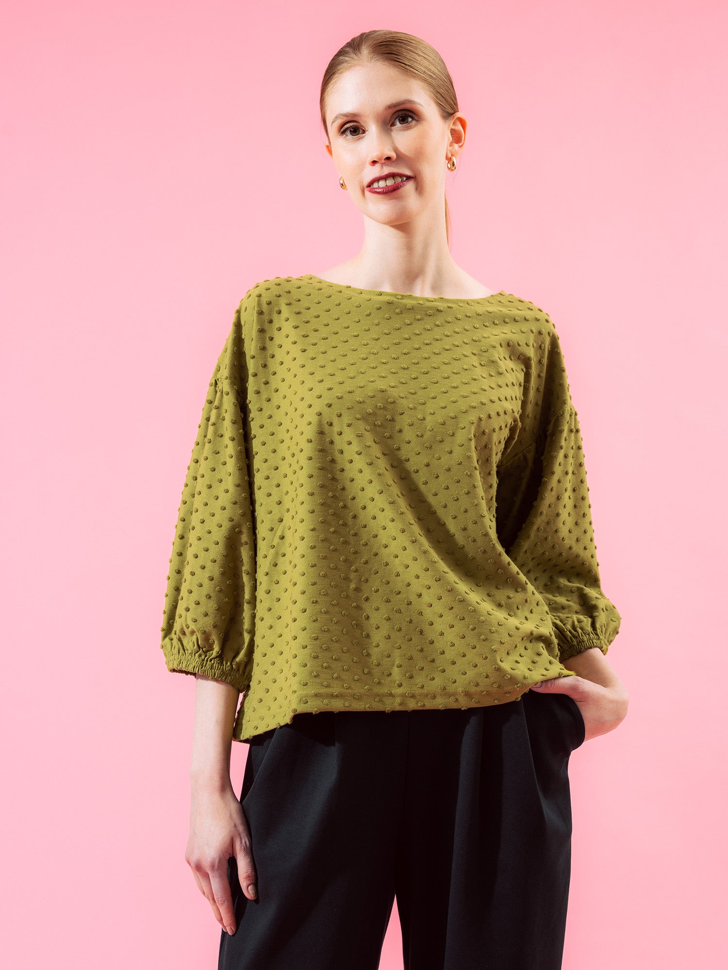 Tyylikäs ja leikkisä Sinna -paita ihastuttaa rennolla mukavuudellaan ja puhvimaisilla hihoillaan! Oliivinvihreä paita on valmistettu Dot -struktuurineuloksesta. Dot on trikoon paksuinen neulos, jossa on froteemaisia pieniä pilkkuja, jotka kohoavat neuloksen pinnasta tehden siitä ihanan eläväisen. Paita sopii hyvin niin toimistolle kuin juhlavampiinkin tilaisuksiin! Malliltaan paita on suora ja mukavan väljä. Vajaamittaiset hihat, hihansuissa ohut kuminauha, laskettu olkasauma. Huomioithan, että materiaali ei sisällä elastaania, joten kangas ei juurikaan jousta.