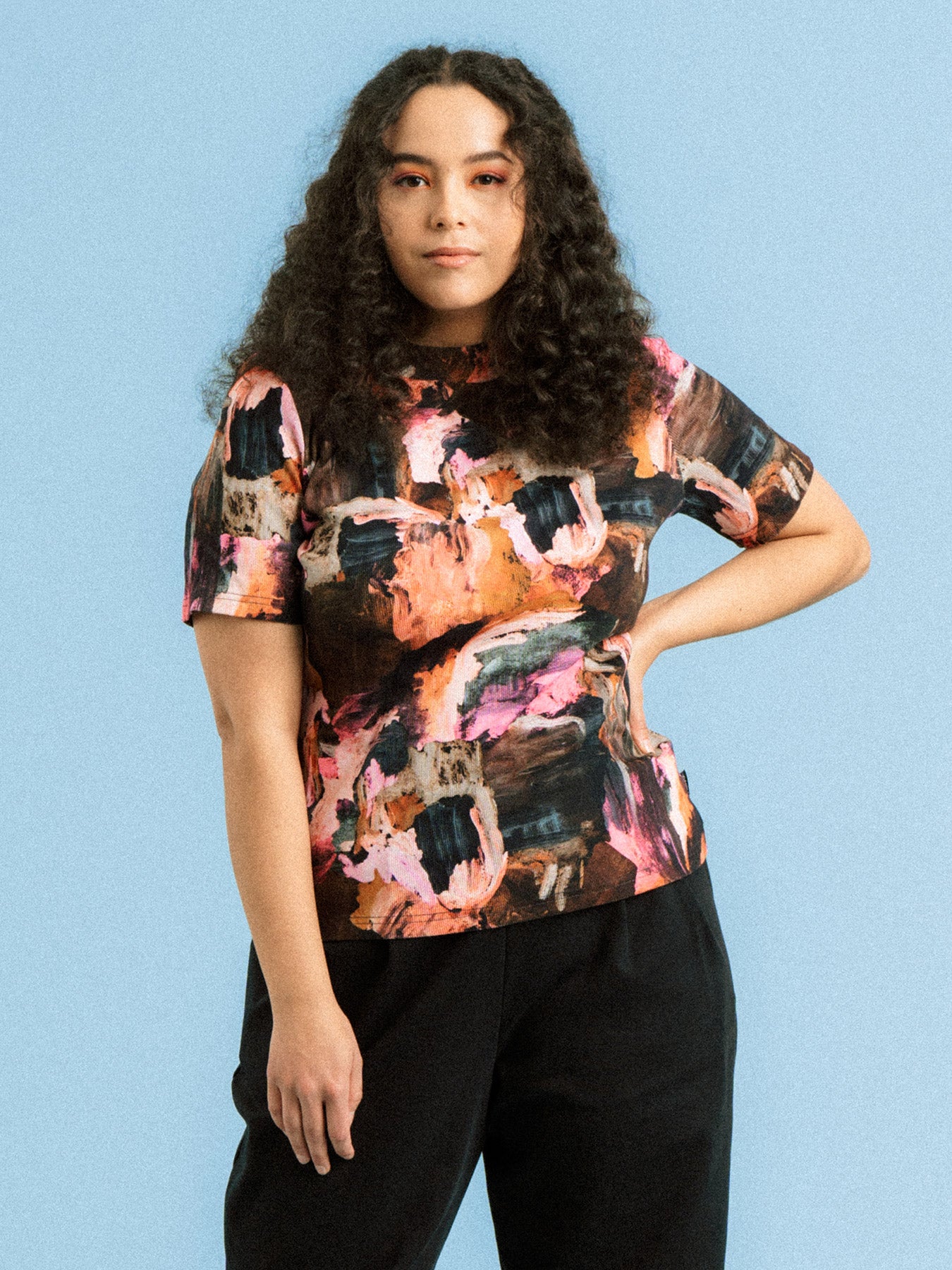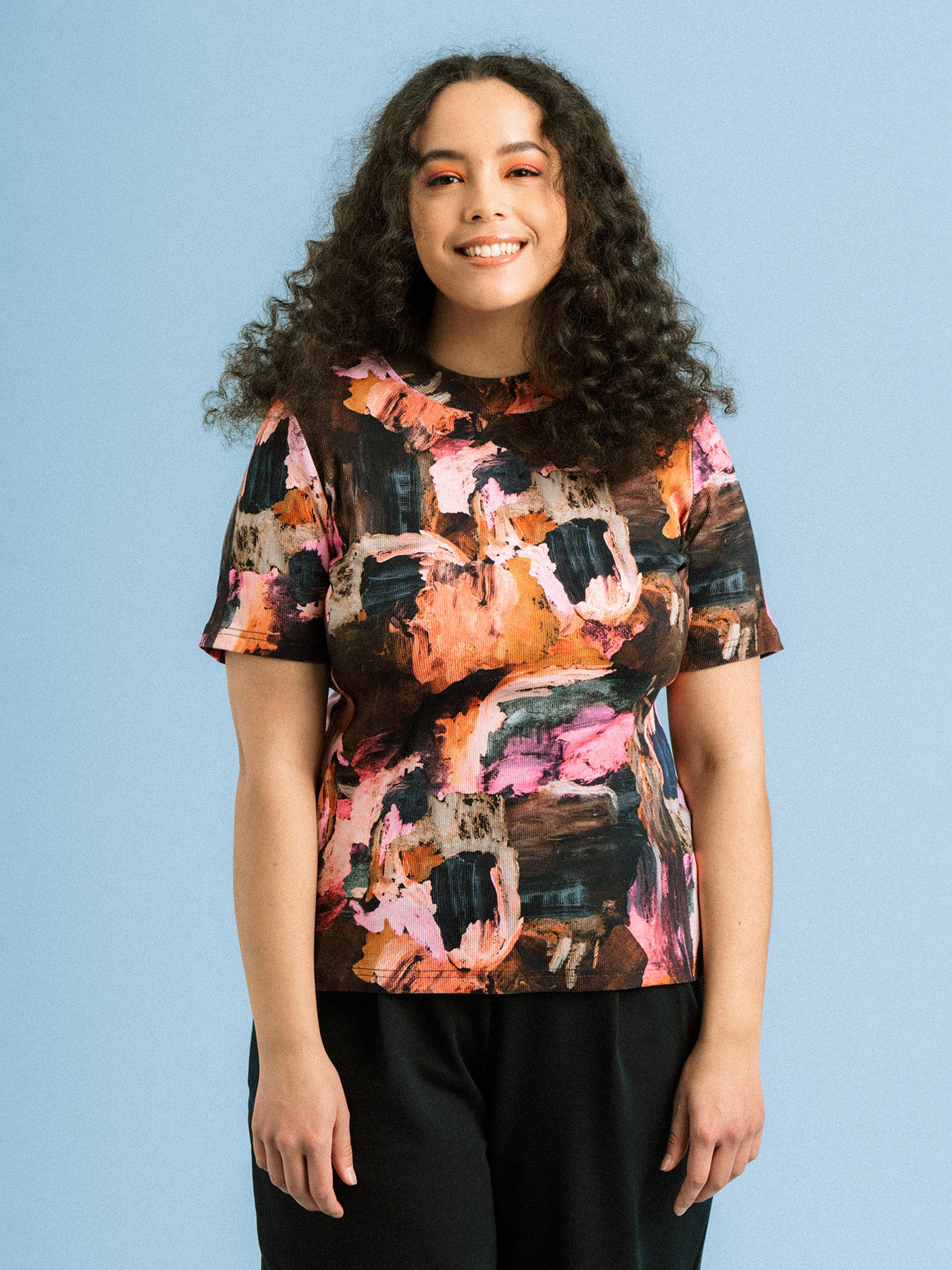 Kilpikonnakauluksella varustettu Rute -ribbipaita on korkealaatuinen luottotuote, joka on helppo yhdistää moneen eri asuun ja tilanteeseen. Klassinen paita sopii niin housujen, farkkujen kuin hameidenkin kanssa ja on mukavan tuntuinen päällä. Värikäs Rosa Fall -kuosi tuo asuun mukavasti piristystä yksiväristen alaosien ja jakkujen/takkien parina. Reilun pituinen t-paitahiha sopii hyvin kesäkeleille, mutta on esimerkiksi neuleen tai Bubble-takin kanssa yhdisteltävissä vuoden ympäri. Paidan helma yltää lantiolle, ribbimateriaali on joustavaa ja helppohoitoista.