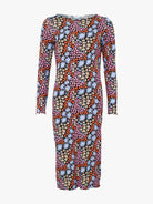 Kukallinen Lizzie mekko värikkäällä Flores -kuosilla tekee asustasi näyttävän! Flores on rohkea ja söpö kukkaprintti, jossa erilaiset pienet kukat muodostavat yhdessä abstraktin kuvion, luoden eloisan visuaalisen kokonaisuuden. Kuosin pohjaväri on musta. Mekon materiaalissa on käytetty LENZING™ ECOVERO™ Viskoosia*, joka tuntuu höyhenen kevyeltä ja ihanan pehmeältä ihoa vasten, tehden mekosta supermukavan käytössä. Materiaali myös laskeutuu kauniisti. Mekko on malliltaan melko suora ja tyköistuva, ja siinä on täyspitkät hihat. Pääntiellä, hihansuissa ja helmassa on salaattireunus-viimeistely.