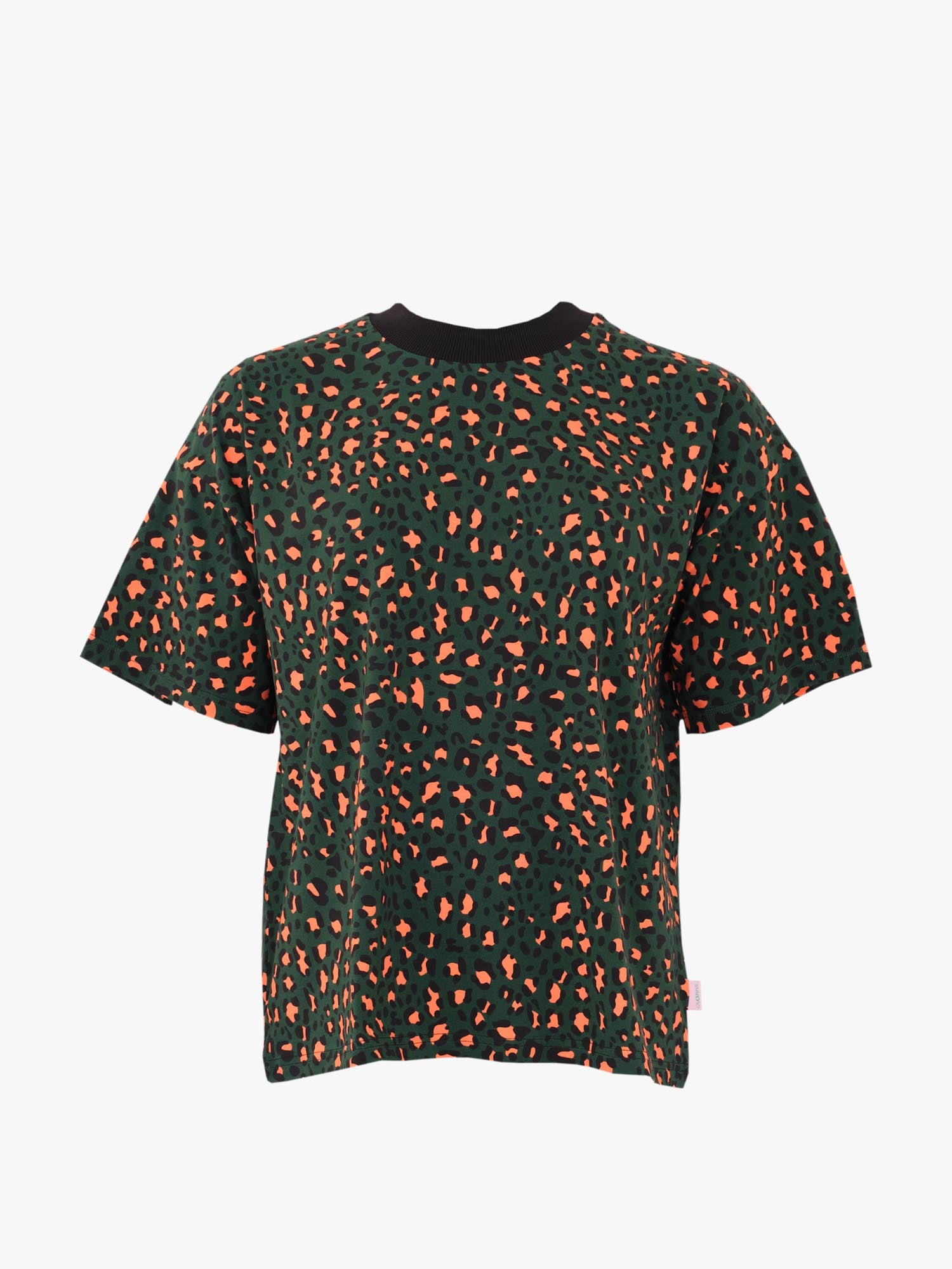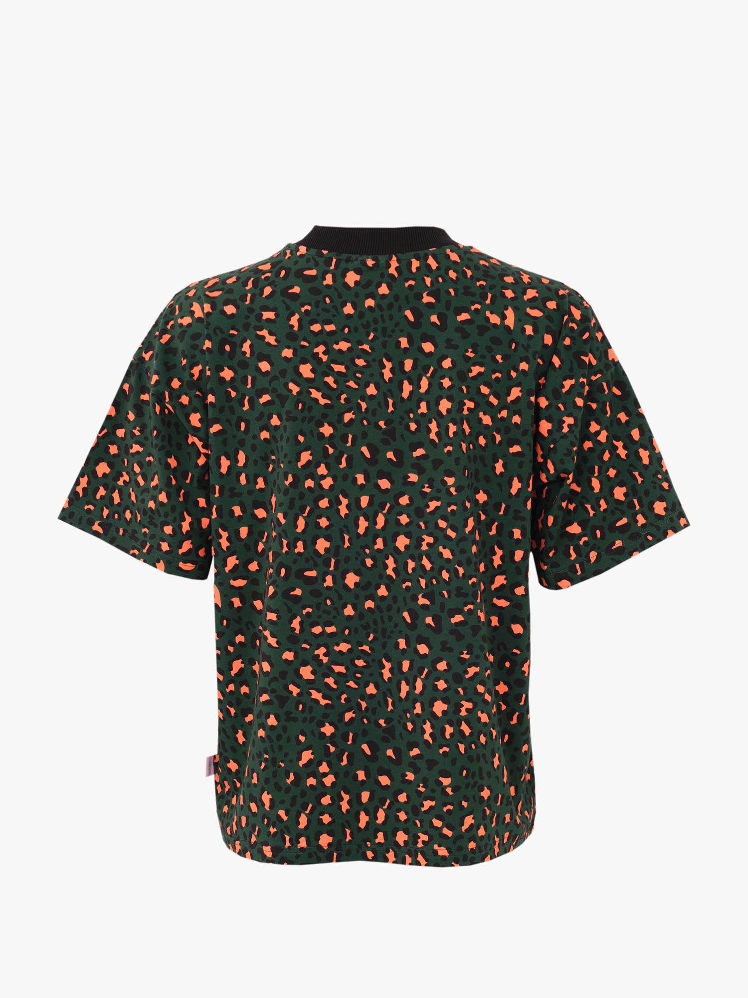 Klassinen leopardikuosi on saanut uuden värityksen! Naisten lyhythihainen Maria paita näyttävällä Leo -kuosilla. Kuosissa on tummanvihreällä pohjalla oranssinsävyisiä leopardi-täpliä. Pääntien resori on musta. Monikäyttöinen paita on helppo yhdistää niin farkkujen, hameiden kuin suorienkin housujen kanssa, ja leopardikuosi tuo kivan säväyksen asuun kuin asuun! Luo virallisempi asukokonaisuus suorien housujen ja nilkkureiden kanssa tai yhdistä Maria -paita rentoihin farkkuihin ja tennareihin vapaa-aikaan. Laatikkomainen, väljä malli, jossa pyöreä pääntie ja lyhyet hihat. Paidan materiaalissa käytetty korkealaatuinen SUPIMA® puuvilla on pitkäkuituista, sileää ja erityisen kestävää. Kuidun ominaisuuksien ansiosta vaatteen pinta ei nukkaannu, ja värit ovat syvemmät ja säilyvät kirkkaina pidempään.