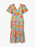 Iloisen värikäs Marla trikoomekko on helppo ja mukava valinta elämän eri tilanteisiin – niin toimistolle, treffeille kuin lounaalle ystävän kanssa! Mekossa on yksityiskohtana V-pääntie edessä ja takana, sekä tyttömäinen frillahelma. Midi-mittainen helma on kätevä eri vuodenajoissa – mekko toimii hyvin myös viileämmällä ilmalla neuletakin ja sukkahousujen tai leggingsien kanssa. Jalkaan vielä tilanteesta riippuen korot, maiharit tai tennarit, niin rento mutta siisti tyyli on valmis. Mekossa on myös taskut. Lyhyet hihat, joissa rypytys olalla.
