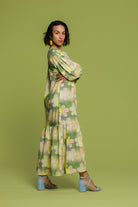 Pyöreä pääntie, puolipitkät puhvihihat. A-linjaisen mekon helma on levenevä.