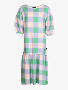 Pyöreä pääntie, puolipitkät puhvihihat. A-linjaisen mekon helma on levenevä.