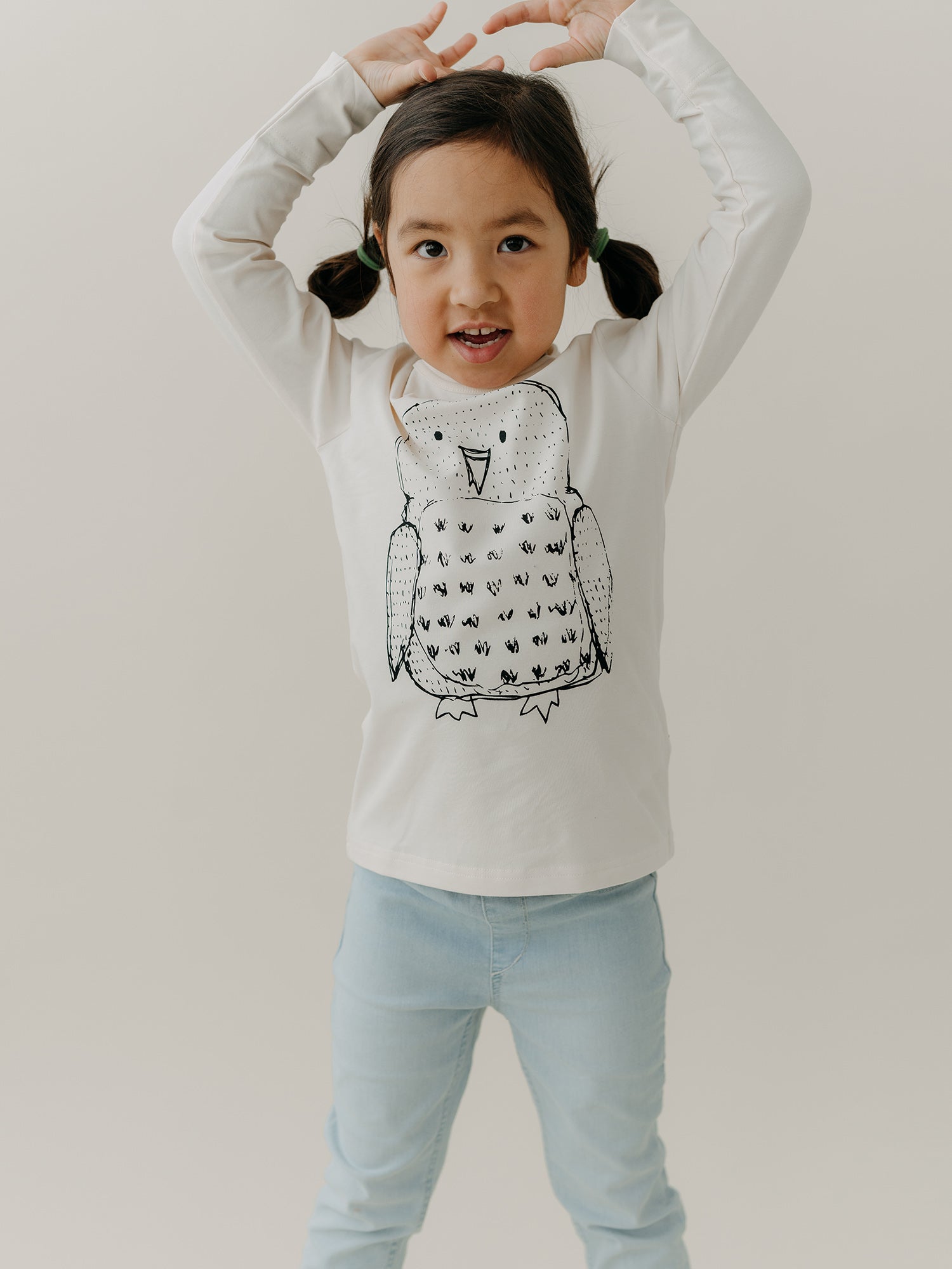 Pitkähihainen, luonnonvalkoinen lasten paita mustalla Pöllö -printillä. Pehmeästä luomupuuvillasta valmistetun paidan hihansuissa on pitkä käänne, jolloin paita kasvaa käyttäjänsä mukana. Korkealaatuinen materiaali saa tuotteen kestämään pesussa ja leikeissä. Pöllöprintti on lasten ikisuosikki. Unisex mallin ja laadukkaan materiaalin ansiosta tuote on helppo kierrättää sisaruksille ja ystäville. Samalla Pöllö -printillä saatavilla myös musta t-paita miehille!