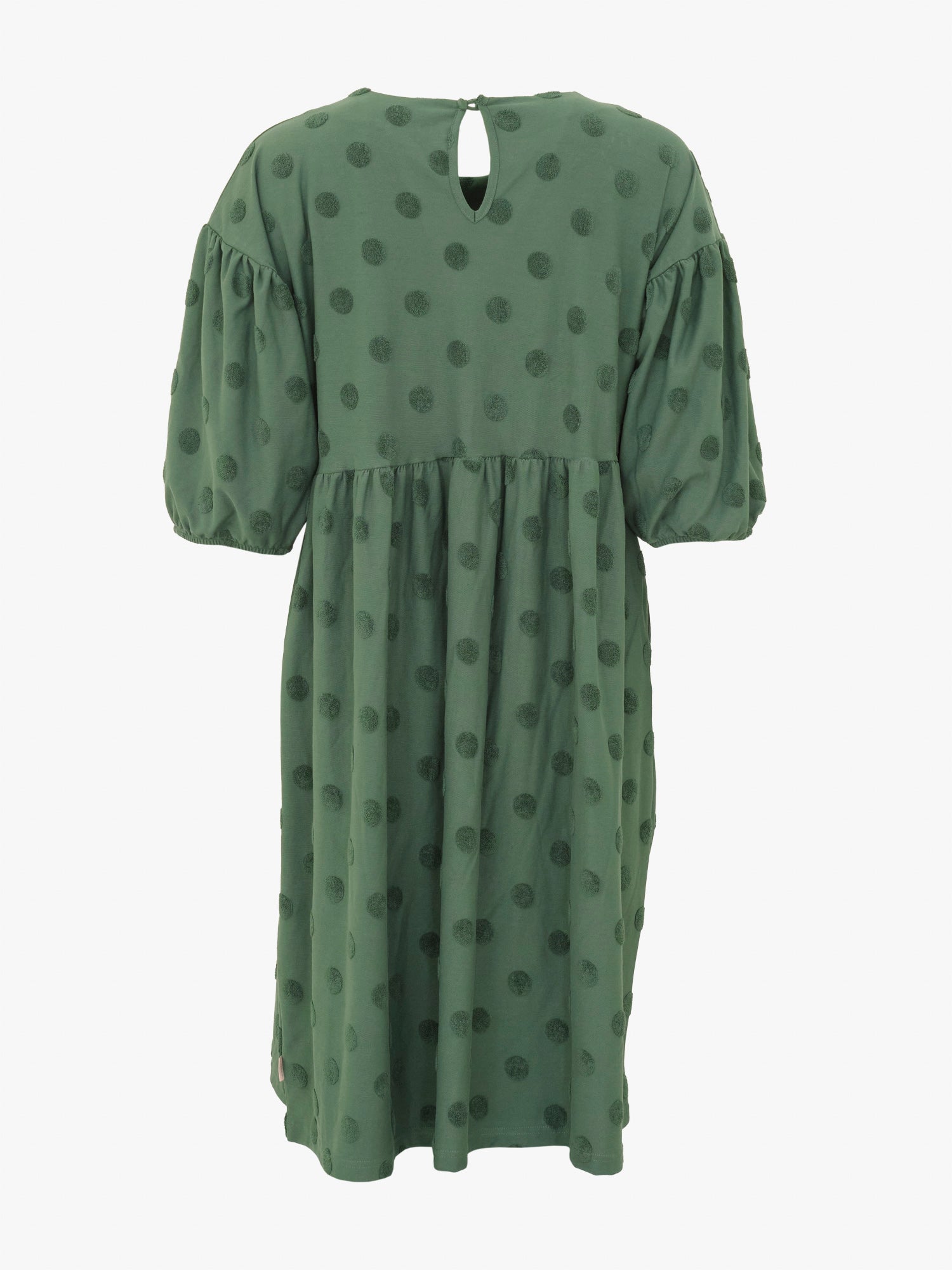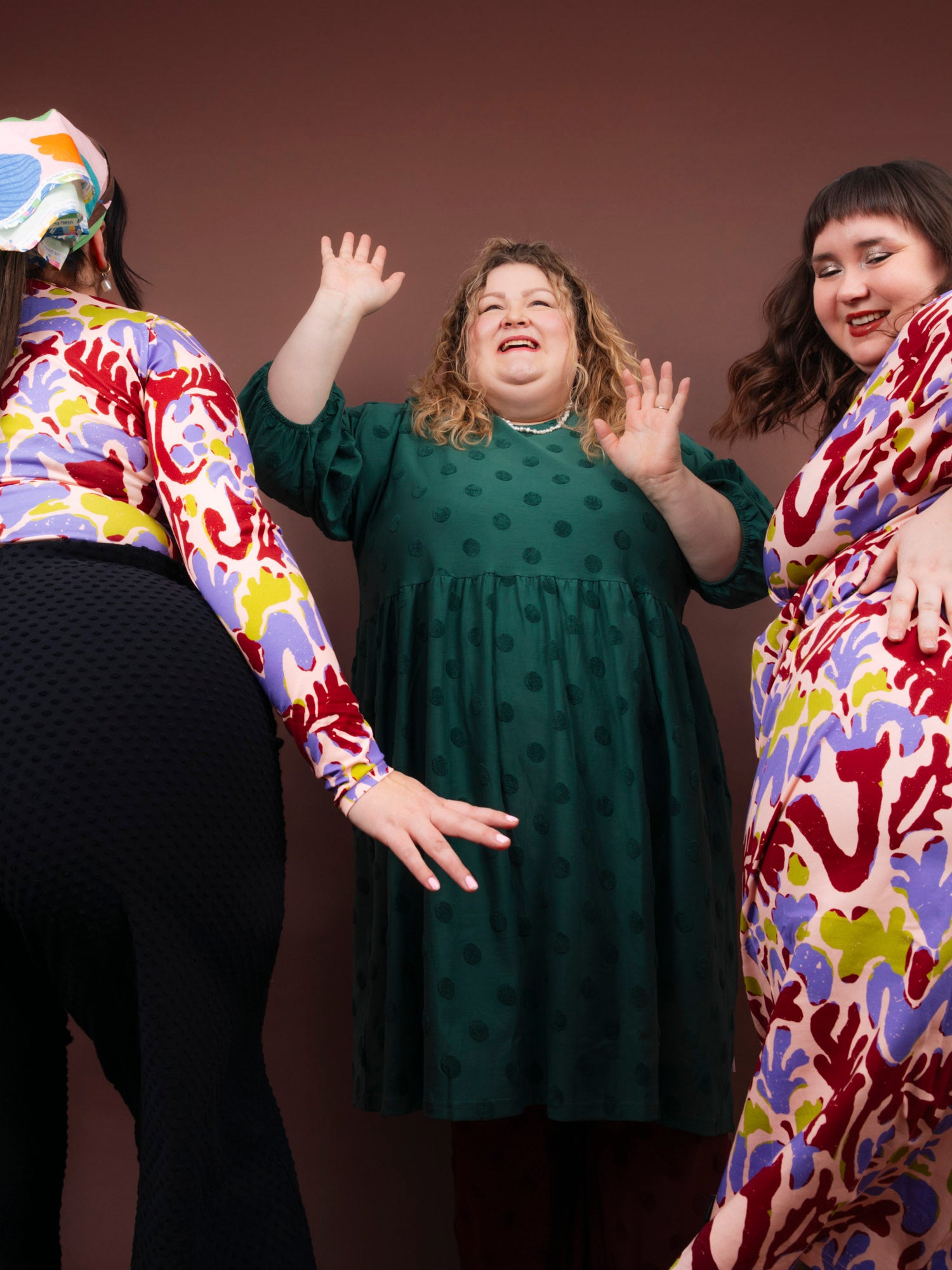 Elena-mekko hurmaa kauniilla puhvimaisilla hihoillaan ja leikkisällä Big Dot -struktuurineuloksella! Big Dot on trikoon vahvuinen neulos, jota elävöittävät pinnasta kohoavat froteemaiset täplät – ne luovat kankaaseen upean, kolmiulotteisen ilmeen. Mekossa on lisäksi käytännölliset taskut. Elena-mekko on vaivattoman tyylikäs valinta, joka sopii niin rentoihin arkipäiviin kuin juhlavampiinkin hetkiin. Polvipituinen helma, 3/4-mittaiset hihat ja laskettu olkasauma tuovat malliin rennon, mutta huolitellun ilmeen. Materiaali ei sisällä elastaania, mutta kangas joustaa silti jonkin verran. Mekko on reilua oversize -mitoitusta, joten suosittelemme valitsemaan yhtä tai kahta kokoa normaalia pienemmän koon, mikäli haluat istuvamman mekon.