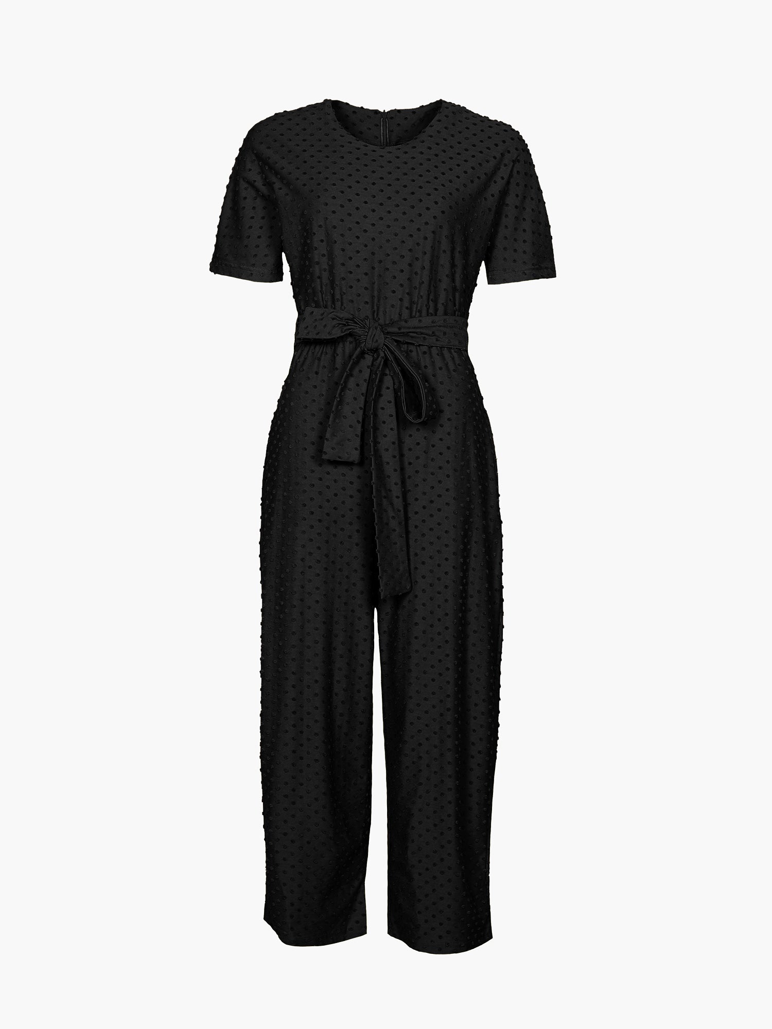 Päivitetty versio suositusta Manuela haalaristamme! Manoe haalarissa selän mittaa on hieman pidennetty, ja haalariin on myös lisätty enemmän väljyyttä. Lyhythihainen haalari on monikäyttöinen ja helppo valinta asukriisin yllättäessä! Korkojen ja huulipunan kanssa haalarin voi pukea juhliin, mutta lenkkareiden ja farkkutakin kanssa haalari sopii hyvin myös arkeen, toimistolle tai kaupungille. Trikoon vahvuisessa Dot-kankaassa on froteemaisia pieniä pilkkuja, jotka tuovat jujua klassiseen, mustaan haalariin. Lahkeet ja yläosa ovat väljempiä, mutta vyötäröltä haalari on istuva. Haalarissa on irrotettava vyö, jonka voit halutessasi korvata myös omalla vyölläsi. Vyötäröllä on lisäksi kuminauha, jolloin haalaria voi käyttää ilman vyötä. Lyhyet hihat, pyöreä pääntie, ja sivuilla kätevät taskut. Selässä vetoketju pukemisen helpottamiseksi.