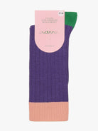 Colorful socks that adds a happy detail to any outfit! These socks combine the softness and breathability of bamboo fiber with bold and vibrant colors that brighten up any situation from everyday life to parties. The main color of the socks is soft bright purple. The heel and toe reinforcements are green and the leg opening is pink. The socks have a slight sheen.