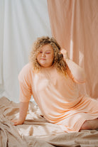 Carly dress has short sleeves, round neck opening and knee length hem. Hemline is longer on the back. Slits on both sides of the hem.