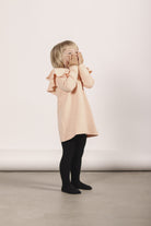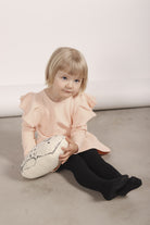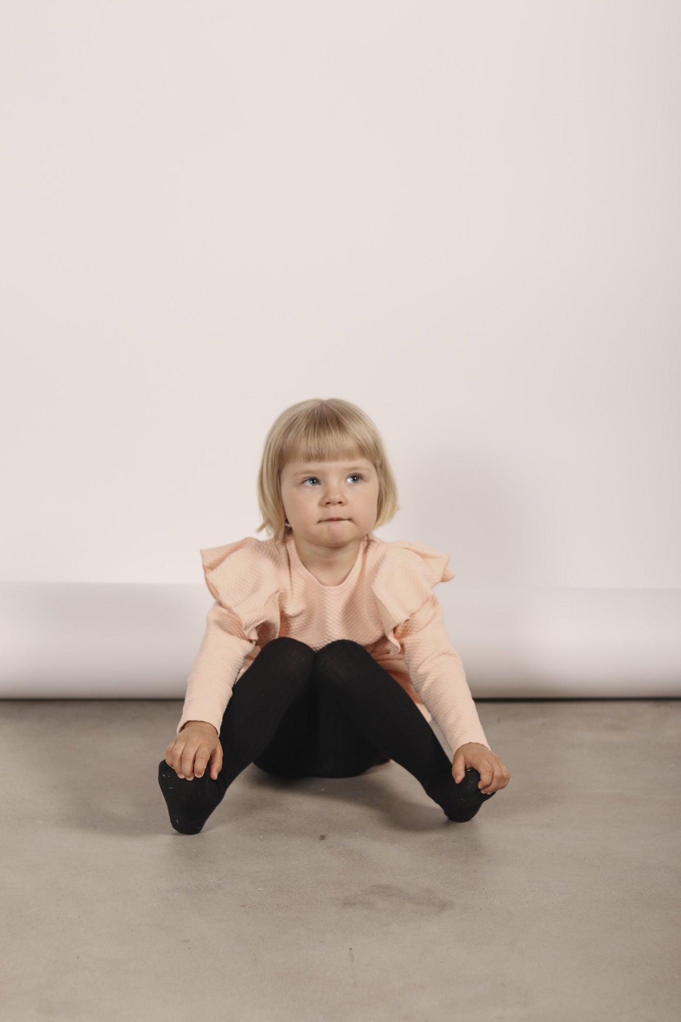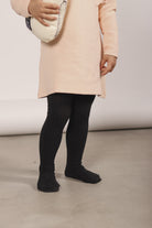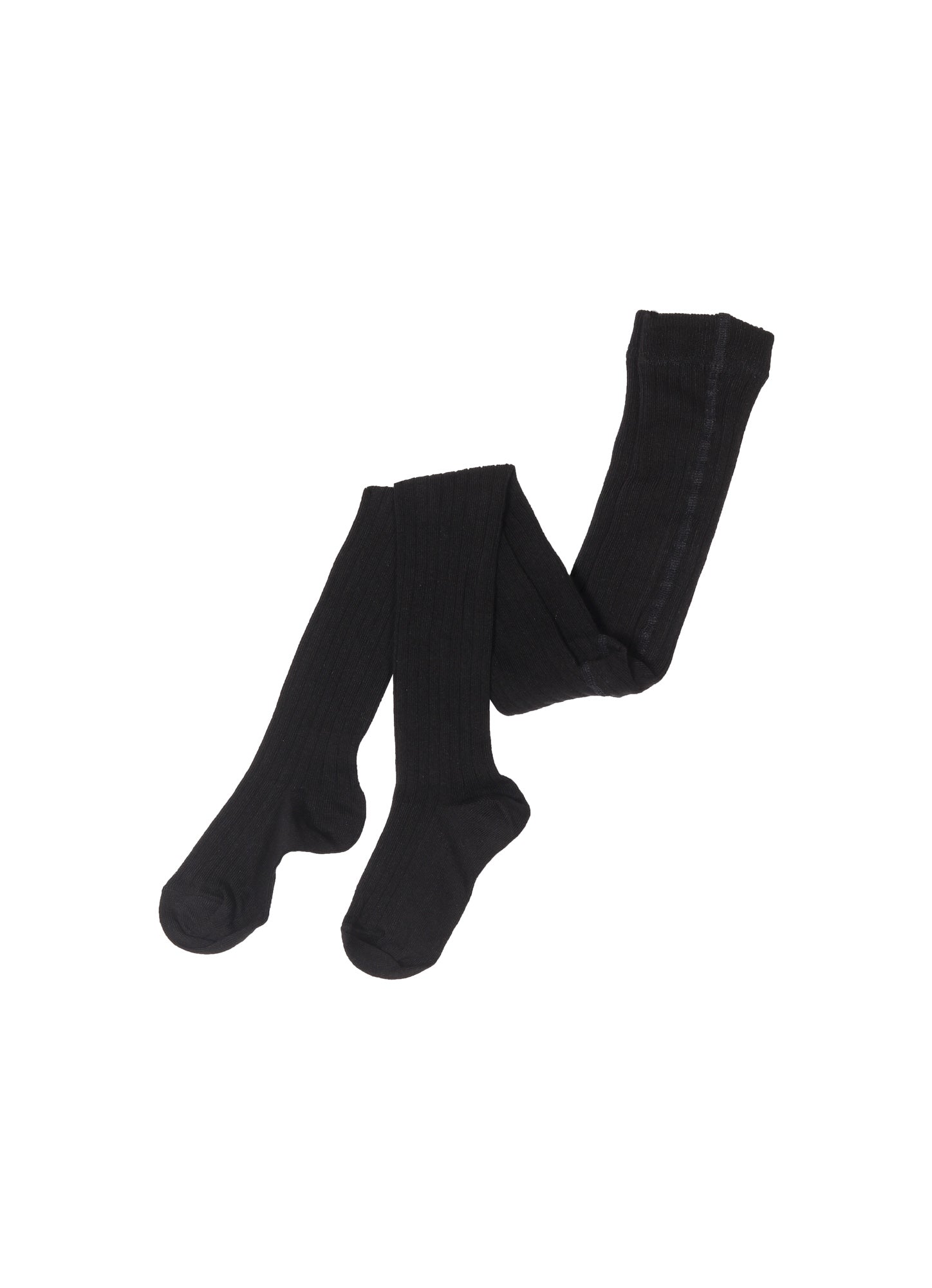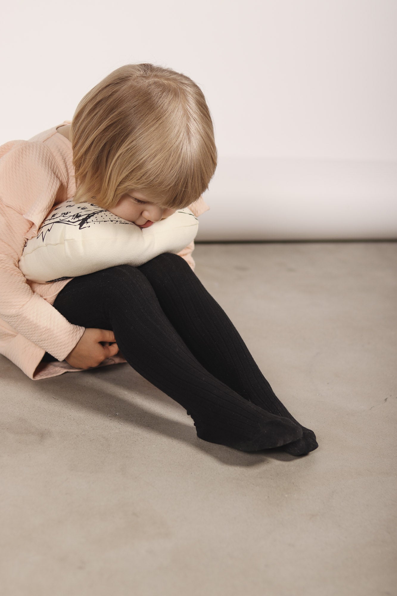 Black rib tights for kids. Comfortable to wear and versatile product that suits for many occasions. Made from organic cotton yarn with a hint of elastane for perfect fit and part of polyamid for non-itchy and durable material. Flat seams make the tights comfortable to wear. Easy to dress around the year with dresses or to use as a mid layer for colder weather. Basic black color is easy to wear with everything, around the year!