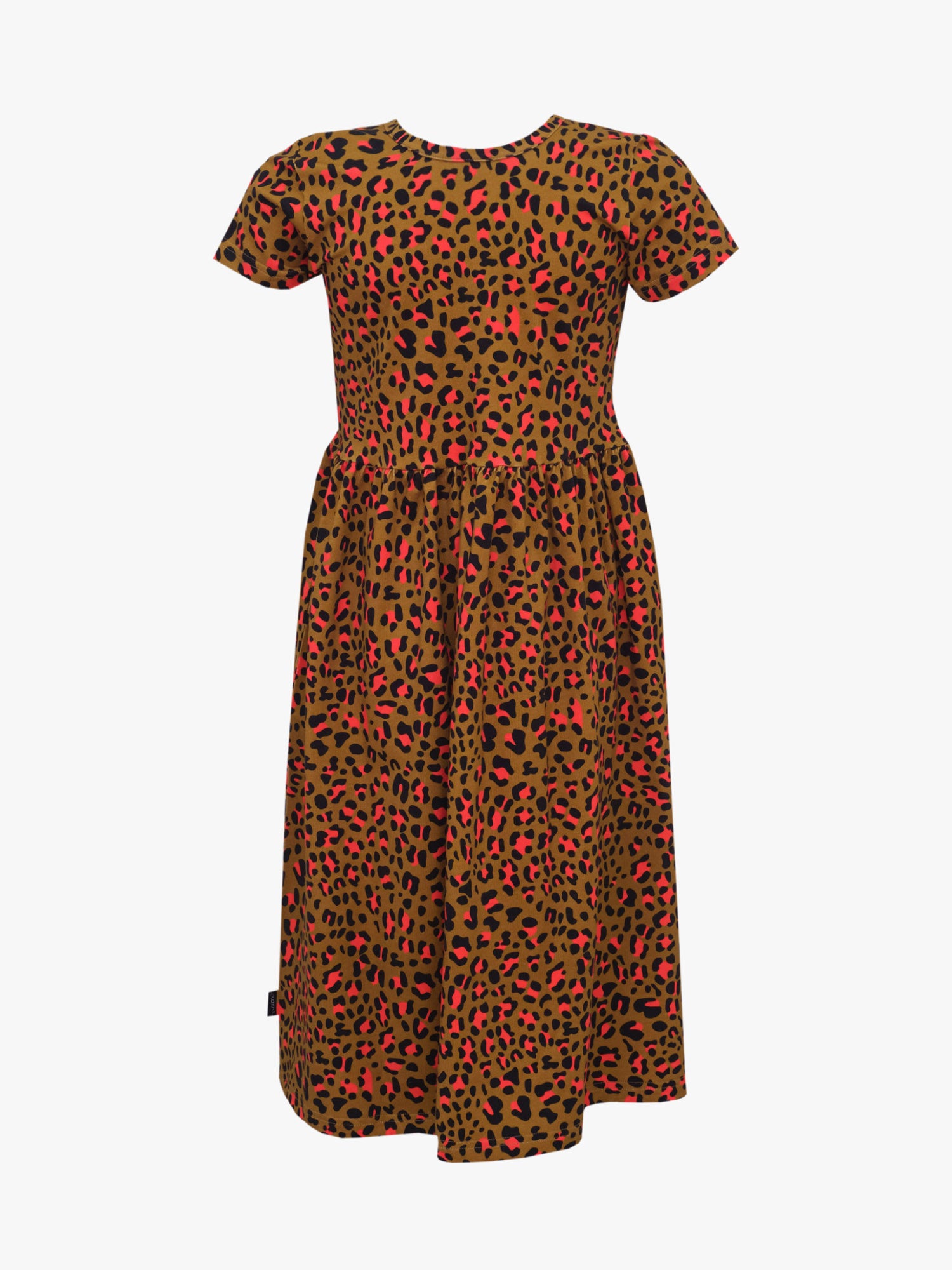 Kids' organic cotton, short-sleeved jersey dress with a colorful leopard print. Create a fun overall set by combining the dress with Ali leggings in the same Leo pattern. Thanks to the high-quality material, the dress withstands washing and playing, and can easily be passed on to siblings or friends. In addition, clothes with the same Leo Caramel print are also available for adults!