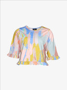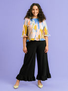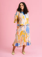 The cute frill hem and frill sleeved Rosalia shirt is suitable for more festive occasions as well as cheerful workwear. If you combine the shirt with the Felicia skirt in the same Wisdom pattern, your outfit is complete. In cooler weather, you can wear this shirt with pants and throw on your shoulder a nice cardigan. The shirt has box shaped, loose fitting and 2/4 sleeves.
