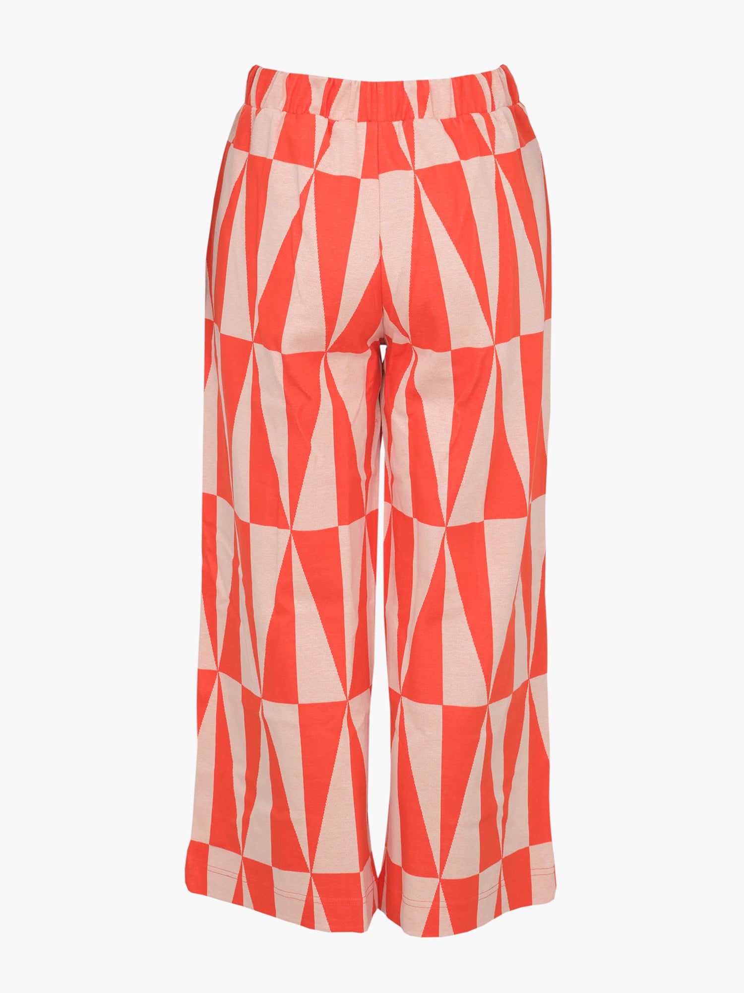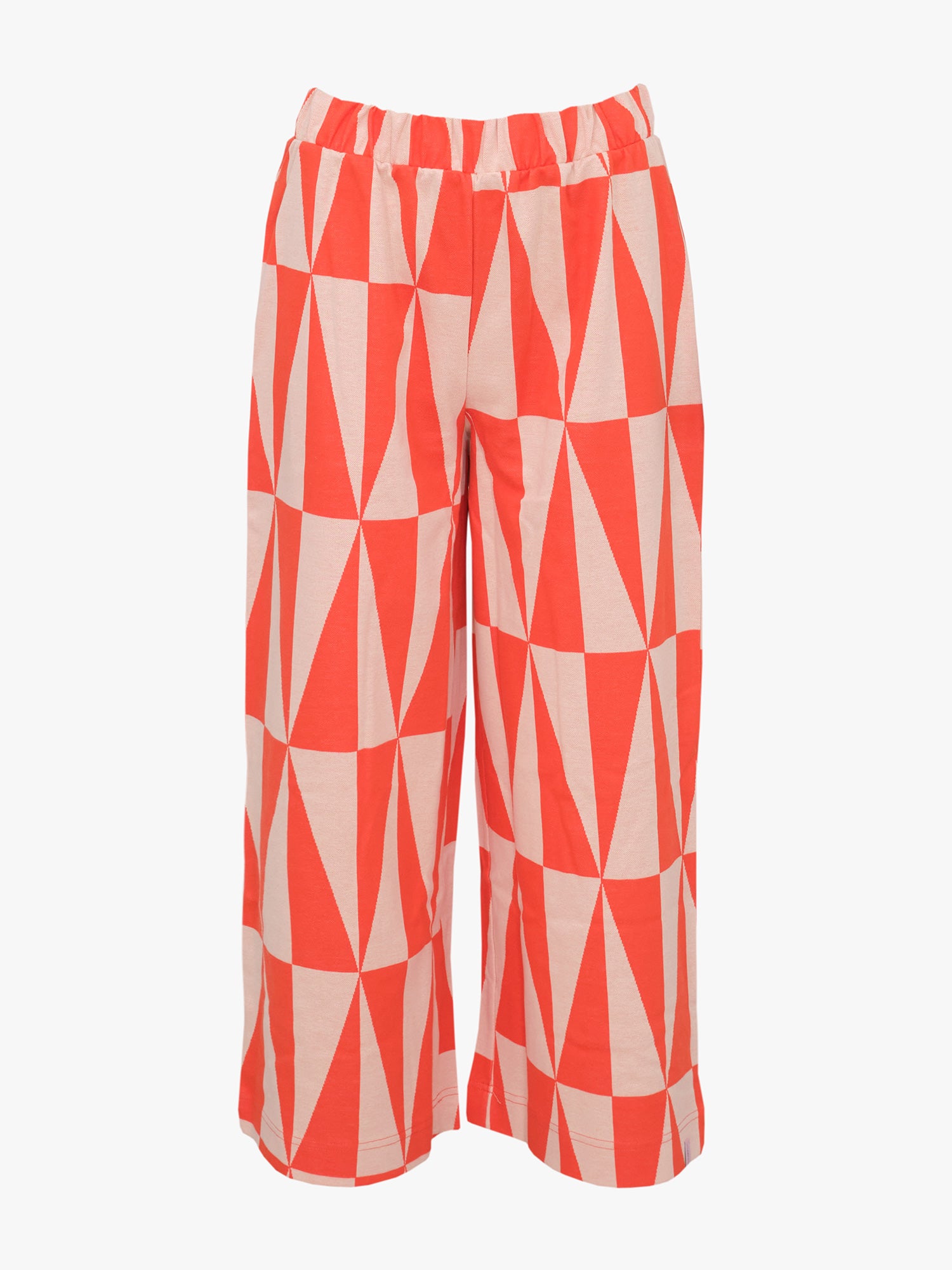 Relaxed Avery culottes pants with a graphic Tiles pattern. The pants have straight, cropped legs and handy pockets on the sides! Wide elastic waistband, that is sewn into the waistband seam so that it doesn't twist and turn. The material is 100% organic cotton jacquard, which is slightly heavier than single jersey. The material does not include elastane, but the knit still has some stretch. Avery pants are a real statement piece on their own, but when paired with the Kayla jacket, you get a complete Tiles pattern outfit.