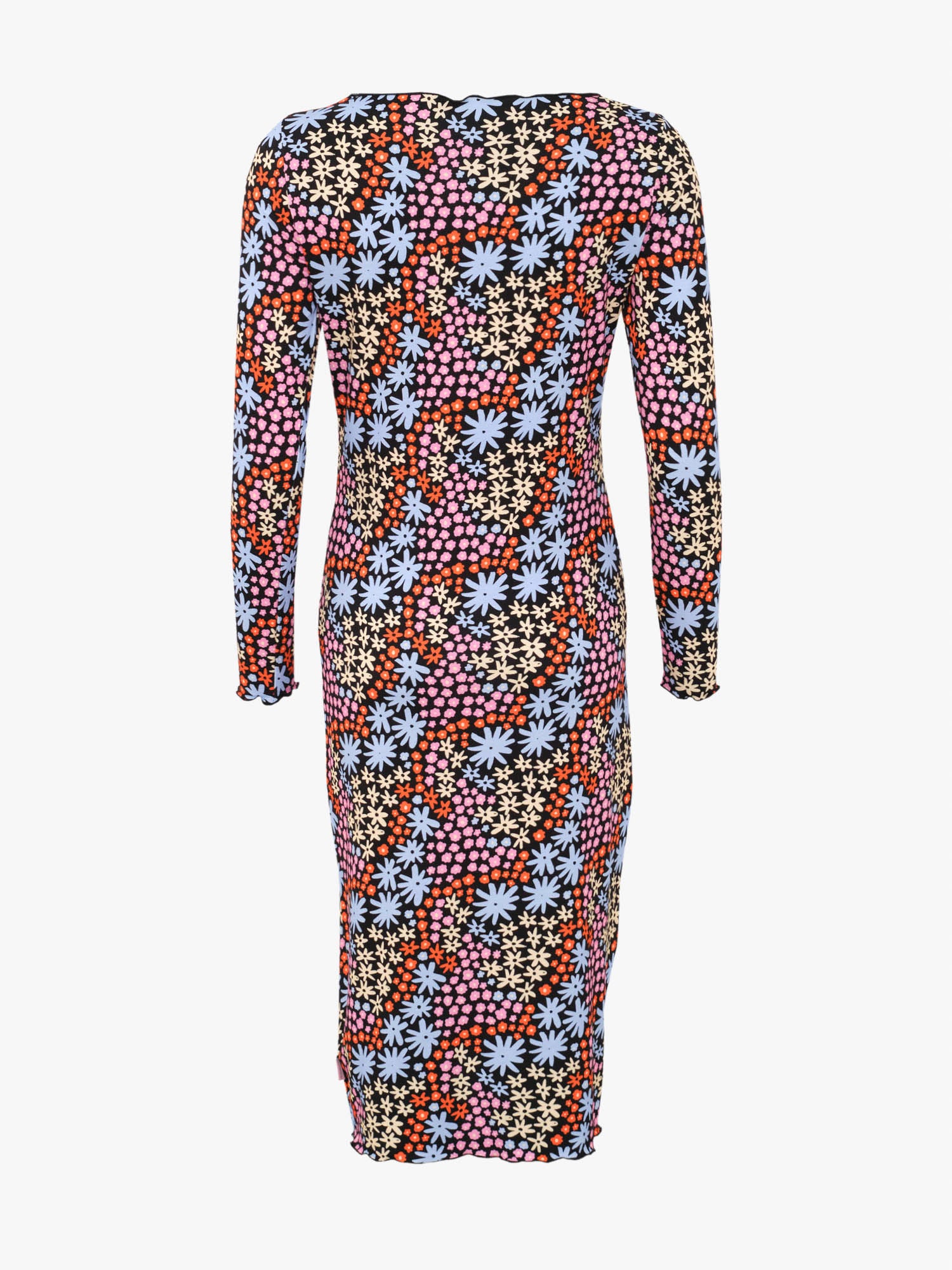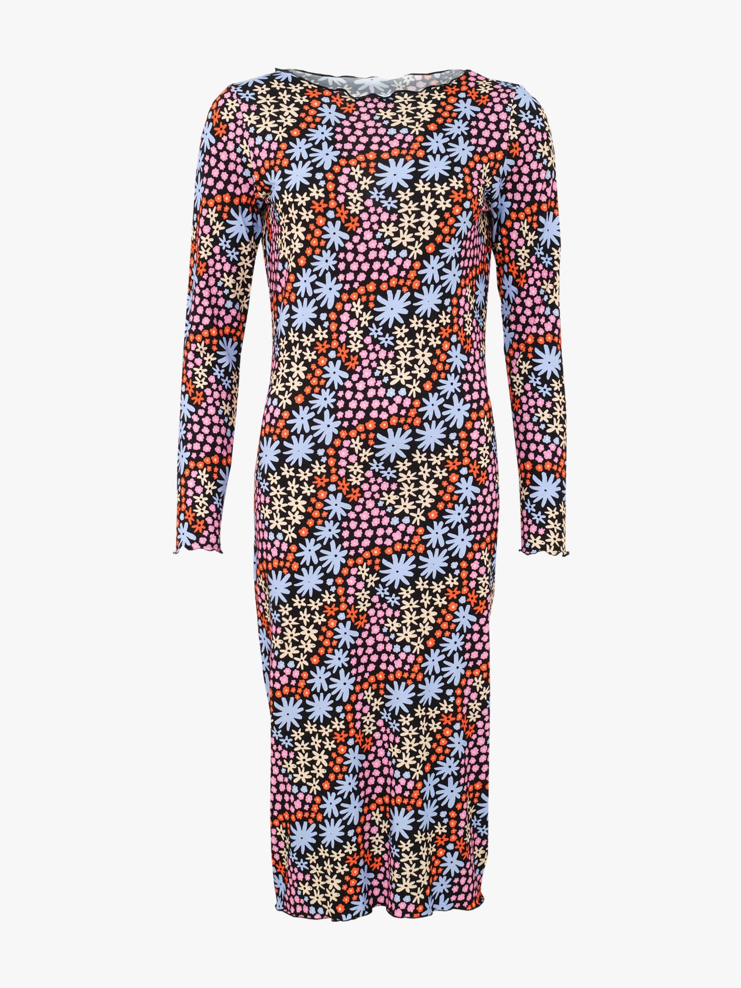 Floral Lizzie dress with vibrantly colorful Flores pattern makes your outfit stand out! Flores is a bold and cute floral print, where different flowers form an abstract pattern together, creating a vibrant visual look. The base color of the print is black. Material of the dress contains LENZING™ ECOVERO™ Viscose*, that feels feather-light and soft against the skin, making the dress super comfortable to wear. Material also has a flowing drape. The form-fitting dress has a fairly straight cut and full length sleeves. The neckline, cuffs and hem have a lettuce border finishing.