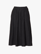 A stunning women's skirt made from our popular Dot fabric. Dot is jersey like fabric with small terry dots that rise from the surface of the fabric, giving it a wonderfully lively texture. The black skirt is versatile and easy to pair for both work and evening outfits. Plus, it has pockets! In summer, the skirt works well with a tank top or t-shirt, but it’s also perfect for cooler weather when paired with tights and a wool sweater. A classic design brought to life by the unique fabric. The Dot material does not include elastane, but the knit still has some stretch.