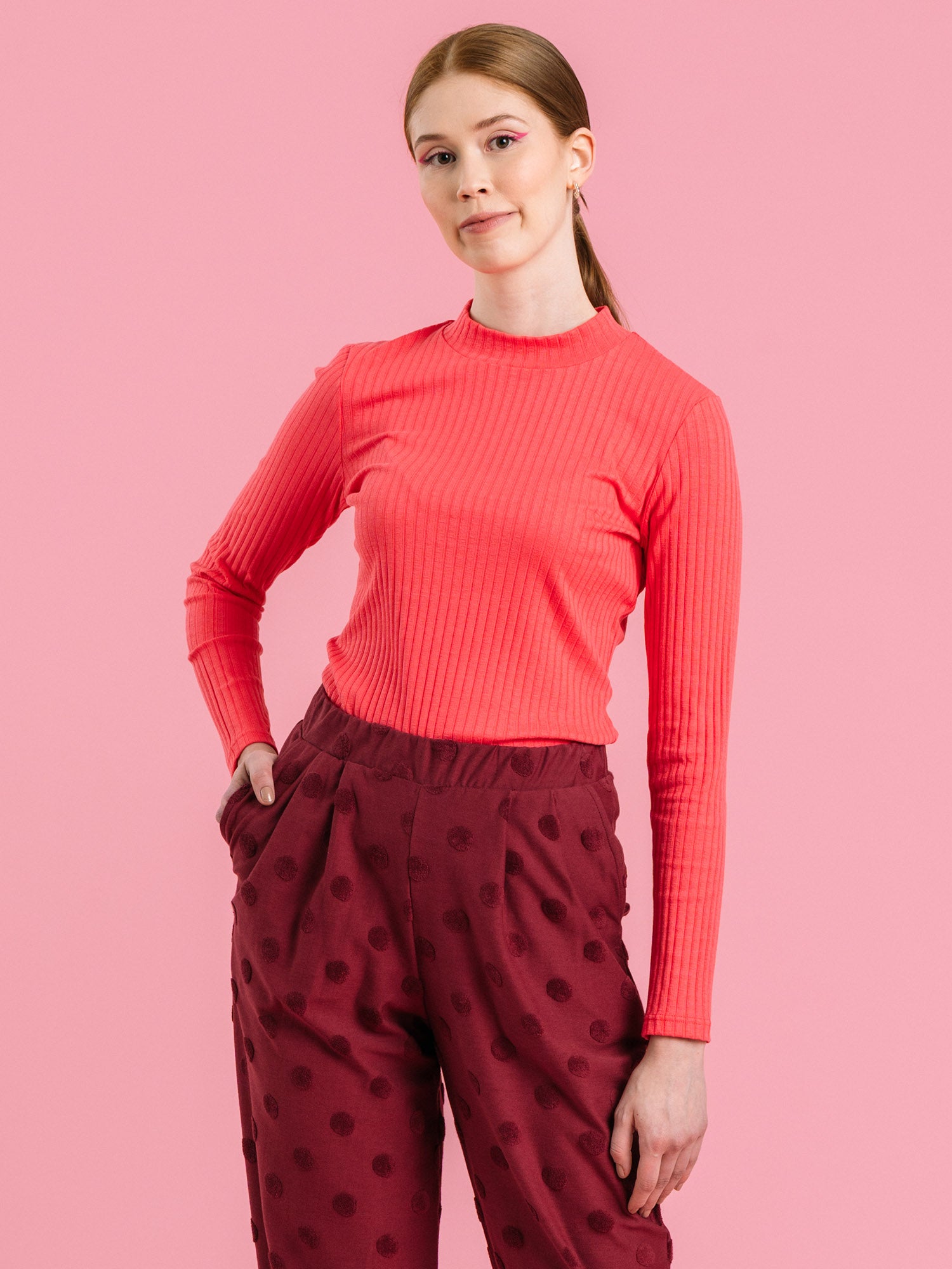 Renata rib shirt is easy to combine with many different outfits and situations. The classic shirt goes well with trousers, jeans and skirts, and is especially comfortable to wear thanks to its elastic rib material. A close-fitting shirt also works well under a cardigan. The shirt has full-length sleeves and a turtleneck. The hem of the shirt is hip-length.