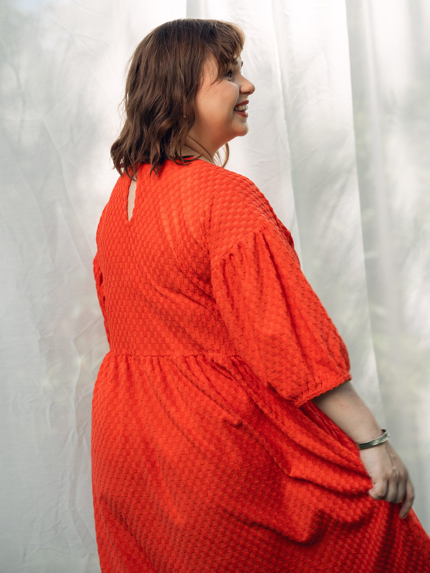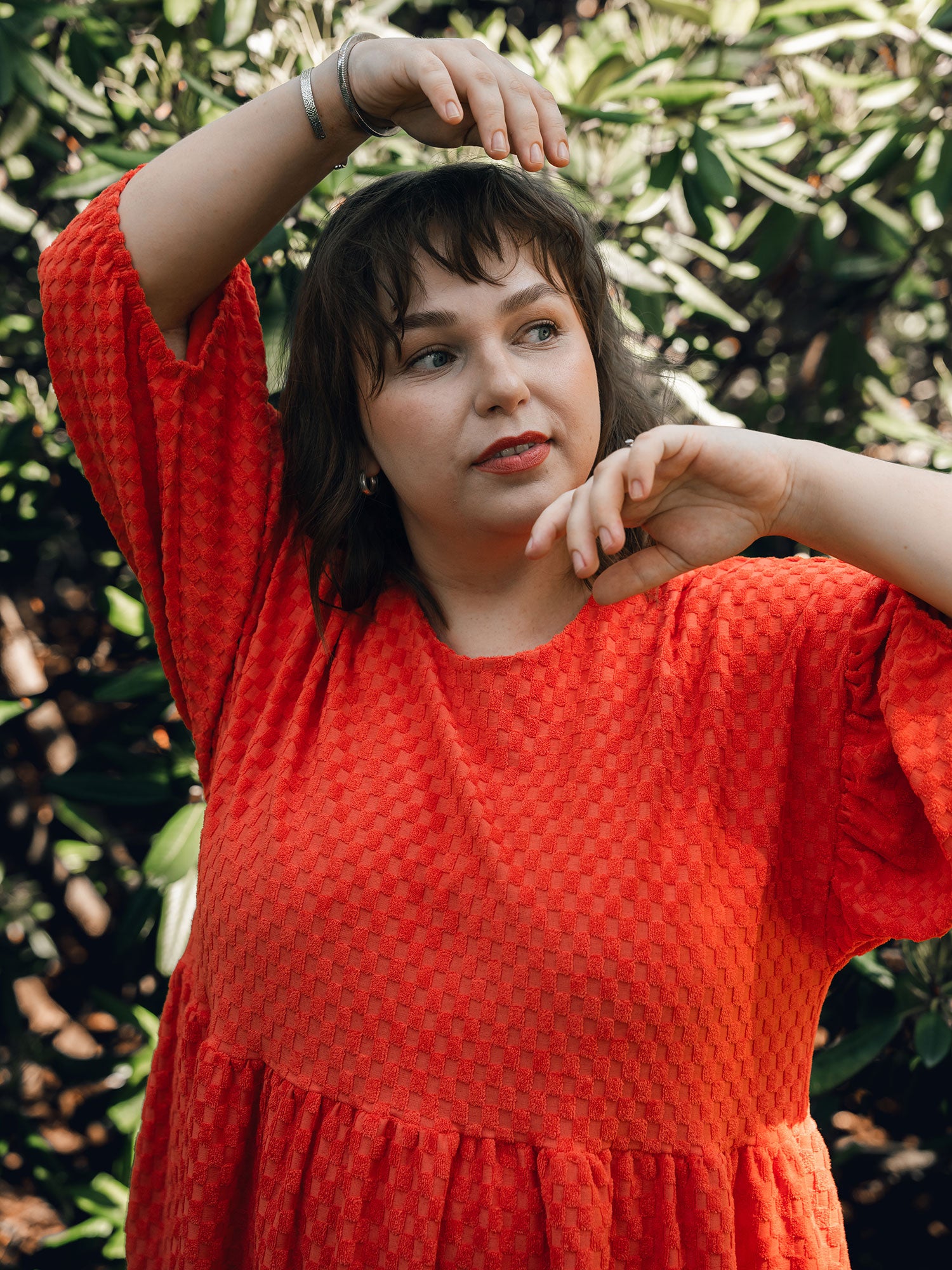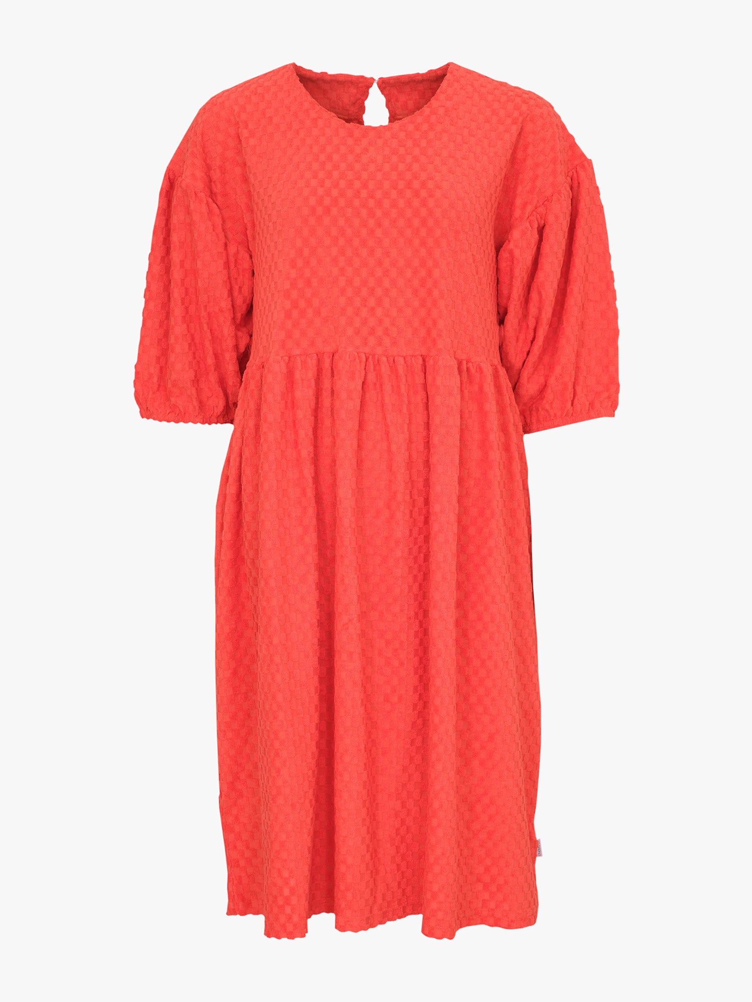 Elena dress delights with its puffy sleeves and fun Square structure! Square is jersey like fabric with terry squares that rise from the surface of the knit, making it wonderfully lively. The dress also has pockets! Stylish Elena dress is easy and carefree choice for both everyday life and more festive occasions. Knee-length hem, 3/4 sleeves, dropped shoulder seam. Please note that the material does not include elastane, so the fabric does not stretch much. The dress is fairly oversized, so we recommend choosing one or two sizes smaller than normal if you want a more fitting dress.
