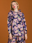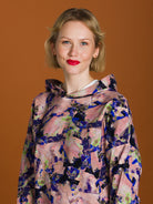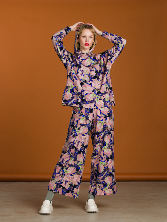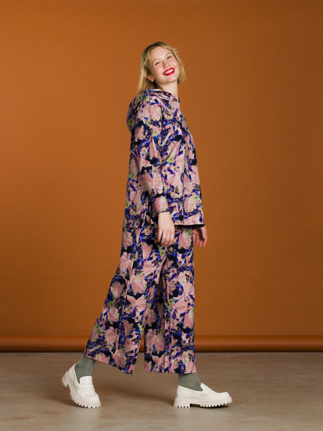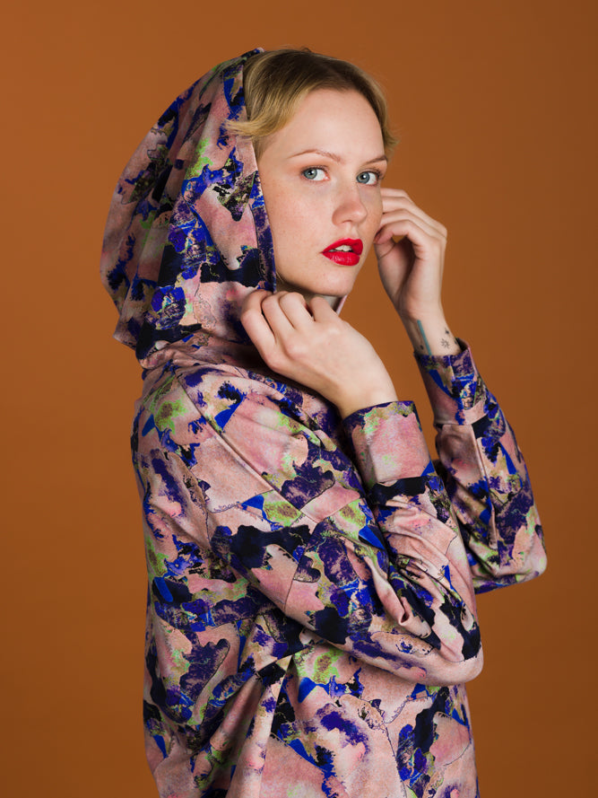 Long sleeves, dropped shoulder seam and slits on both sides of the hem. Organic cotton stretch college is comfortable material and easy to take care of.
