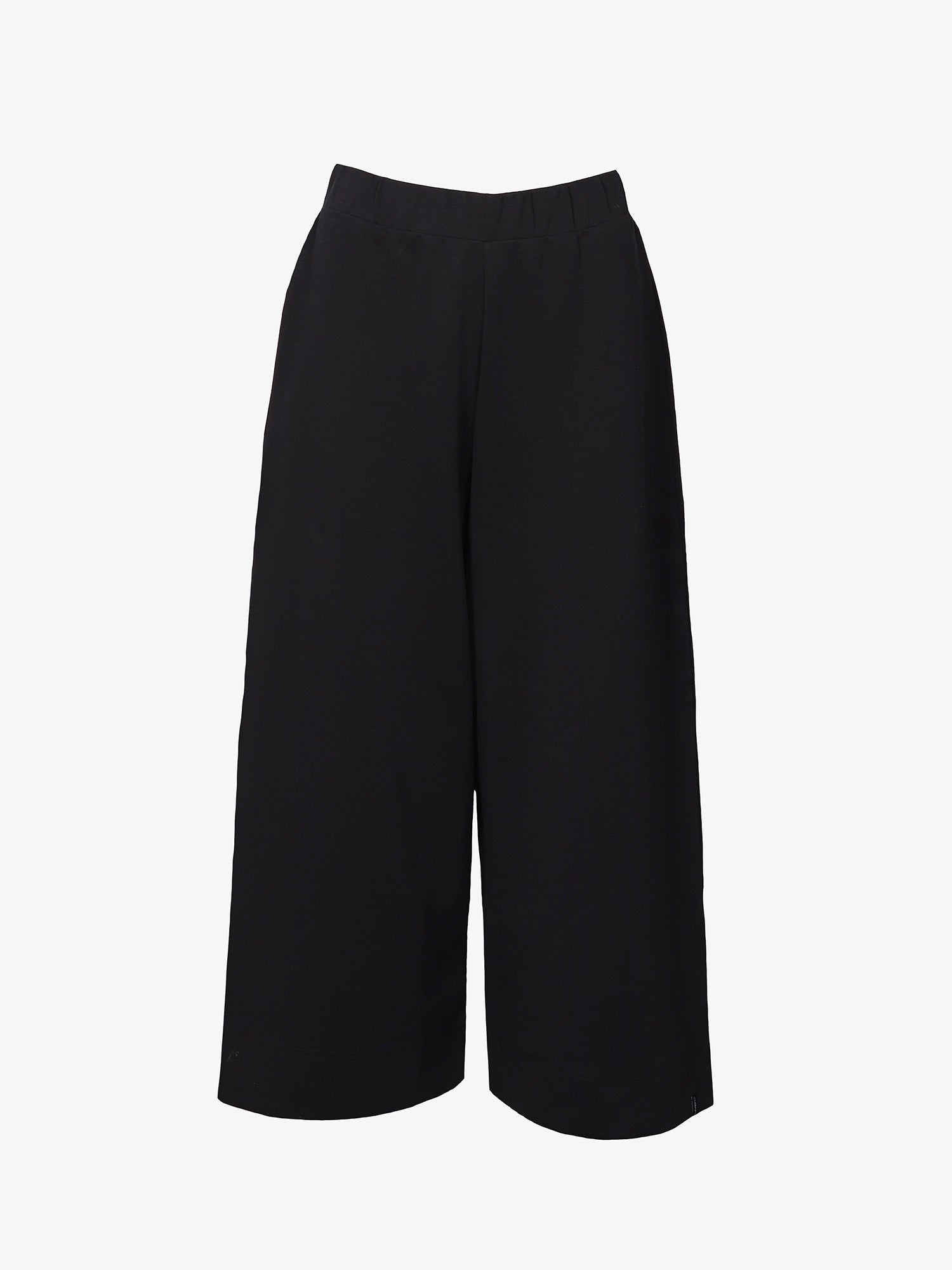 High-waist culottes pants are fit at waist but have wide legs. The legs are not full-length. Versatile and easy-to-combine model – you'll want to wear these every day!  These pants are made of Ponto Roma interlock quality, which is heavier than single jersey, and it drapes beautifully and does not rise when walking. Interlock also keeps it's shape better than single jersey. Combine, for example, with a printed top and a soft woolen sweater.