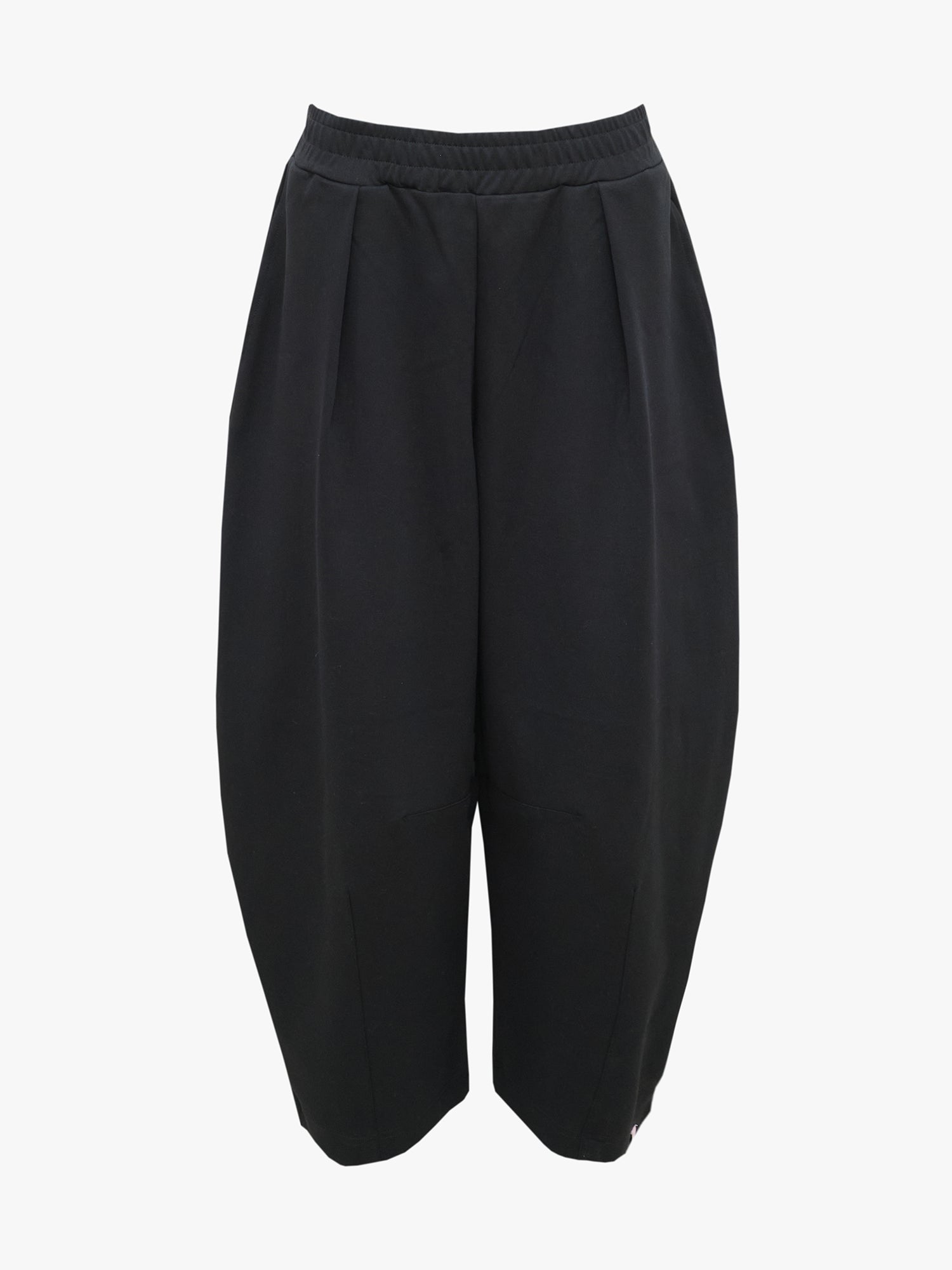 Relaxed, balloon shaped pants are comfortable to wear, but they also fit for a more formal outfit. These pants also have pockets. The Ponto Roma interlock material is heavier than single jersey, and it makes the pants more dressier. Shape pleats at the knees and legs. Slightly undersized leg length, elastic band at waist. Combine with boots, a plush sweater and a t-shirt for a casual outfit, or dress it up with a collared shirt and lipstick for a comfortable outfit for a more formal occasion.