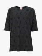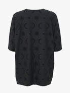 Comfortable, relaxed oversized t-shirt is a piece of clothing that is suitable for both the office and leisure time. The key to the shirt is the Divine structure knit, where terry-like, celestial-themed patterns rise from the surface of the knit, bringing an interesting detail to the black shirt. The shirt has a round neckline, 1/2 sleeves, and a dropped shoulder seam. Jacquard knit is slightly heavier than single jersey. Material doesn't include elastane, but it still has some stretch.
