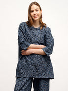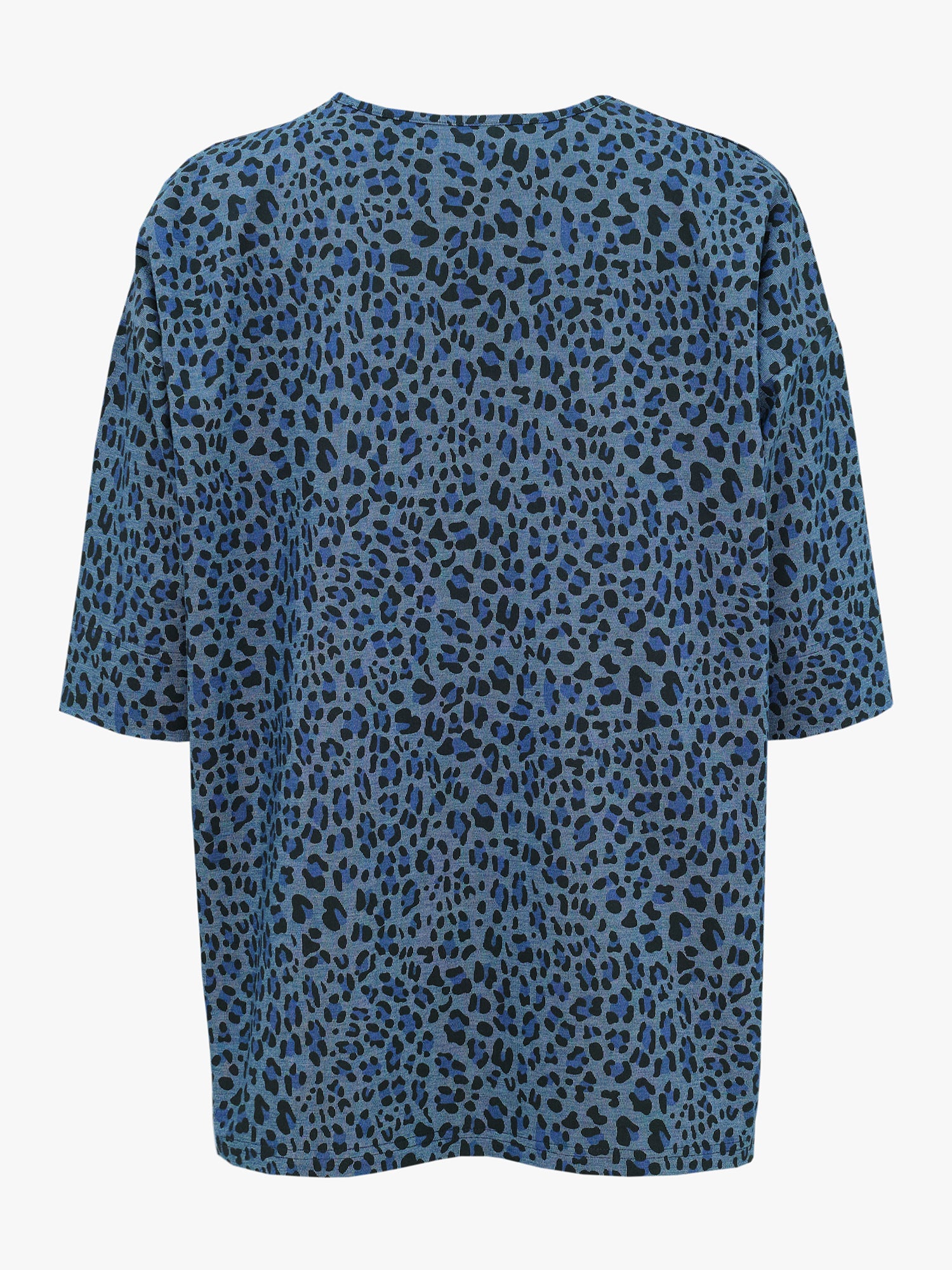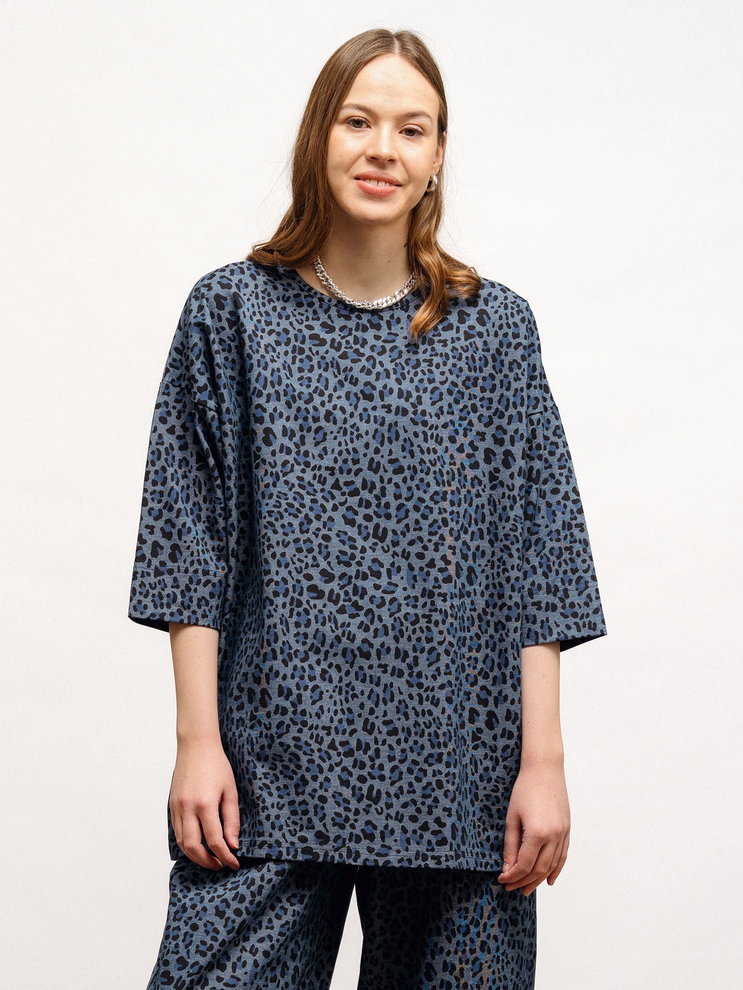 Comfortable, oversize leopard-print t-shirt is a versatile piece that is suitable for both the office and leisure time. The shirt has a round neckline, 1/2 sleeves, and a dropped shoulder seam. Material is a sturdy but elastic, denim-style tricot knit.