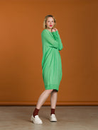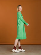 Mekossa on pitkät hihat, laskettu olkasauma ja kaareva pääntie. Helma on riittävän pitkä myös pitkäsääriselle sukkahousuihin yhdistettäväksi. Ajaton ja tyylikäs mekko on valmistettu lämpimästä, mutta hyvin hengittävästä merinovillasta. Merinovilla on oiva materiaali syys- ja kevätkeleille, mutta toimii hyvin myös talven pakkasilla paksumpien sukkahousujen tai legginsien kanssa yhdistettynä.